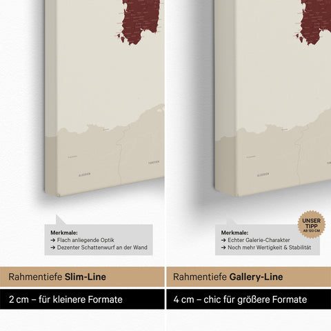 Vergleich der Rahmentiefe unser Weltkarten Pinn-Leinwand, zwischen Slim-Line mit 2 cm Tiefe und Gallery-Line mit 4 cm Tiefe