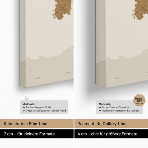 Vergleich der Rahmentiefe unser Weltkarten Pinn-Leinwand, zwischen Slim-Line mit 2 cm Tiefe und Gallery-Line mit 4 cm Tiefe