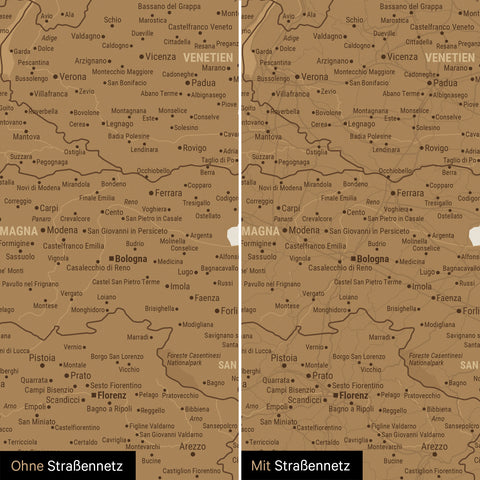In order to keep the design as minimalist as possible, we do not include too many details in the land areas. If this is not enough for you, you can optionally add a road network: This visual addition visibly loosens up the background, provides better orientation on the map and increases the level of detail to the maximum - here using our Europe map as an example.