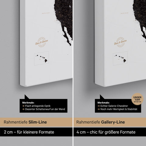 Vergleich der Rahmentiefe unser Weltkarten Pinn-Leinwand, zwischen Slim-Line mit 2 cm Tiefe und Gallery-Line mit 4 cm Tiefe